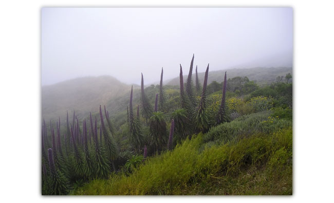 the fog of spring mutes the light illuminating a young grove of Pride of Madera